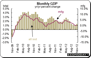 November monthly gross domestic product was up 0.3 percent on the month and 1.3 percent on the year. November's pick-up in total output was largely attributable to a 0.6 percent increase in activity in the goods producing sector, within which manufacturing was up 0.7 percent. There were also decent gains in utilities (1.4 percent) and in mining, quarrying & oil & gas extraction (0.8 percent). Agriculture, forestry and fishing advanced 0.4 percent but construction was only flat. Service sector activity expanded a minimal 0.1 percent on the month, maintaining the very sluggish pace seen since August. Wholesale trade (0.7 percent) and retail trade (0.6 percent) performed relatively well and transportation & warehousing (0.4 percent) also made fresh ground. However, gains here were almost offset by declines in accommodation & food services (0.9 percent), arts, entertainment & recreation (0.3 percent) as well as a number of smaller declines elsewhere.