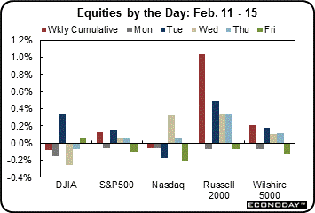 Equities were mixed this past week. The Dow was down 0.1 percent; the S&P 500, up 0.1 percent; the Nasdaq, down 0.1 percent; the Russell 2000, up 1.0 percent; and the Wilshire 5000, up o.2 percent.