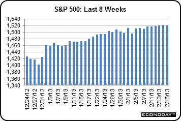 Stocks again were mixed on Thursday with the Dow easing and other indexes posting modest gains. Initial jobless claims were down notably but news from overseas weighed on stocks. Gross domestic product for the Eurozone declined at a faster than expected rate. The German and French economies also contracted more than forecast in the fourth quarter. Equities mostly declined modestly on Friday despite a boost in consumer sentiment and unexpected boost in Empire State manufacturing. National industrial production was weaker than expected and a leaked internal email on supposedly negative Wal-Mart sales pushed equities down.