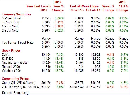 At mid-week, equities were mixed but mostly positive. However, the Dow dipped after US President Obama Tuesday night called for raising the federal minimum wage to $9 an hour with McDonald’s a notable decliner. Coke also weighed on the Dow after reporting disappointing results. Retail sales for January were close to expectations and were modestly positive after earlier strong gains.