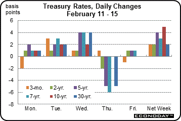 For this past week Treasury rates were up as follows: 3-month T-bill, up 2 basis points; the 2-year note, up 2 basis points; the 5-year note, up 4 basis points; the 7-year note, up 3 basis points; the 10-year note, up 5 basis points; and the 30-year bond, up 2 basis points.