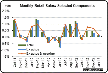 Gasoline sales were up a modest 0.2 percent in January, following a 1.7 percent drop the month before. Excluding both autos and gasoline components, sales gained 0.2 percent after increasing 0.7 percent in December (originally up 0.6 percent) and following a 0.8 percent boost in November.