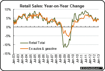 Clearly the pace of spending slowed in January. However, it is hard to discern the impact of higher taxes given that January came off a strong December. Pullback is normal after prior strength. Higher payroll taxes have cut into disposable income but spending habits change slowly. It is going to take additional reports to determine the impact of higher payroll and income taxes on retail sales.