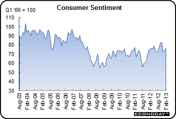 The consumer's economic assessment continues to improve but remains below where it was going into year end. Consumer sentiment rose a solid 2.5 points to 76.3 for the mid-month February reading but was still well below the low 80 readings in October and November which were the recovery's best.