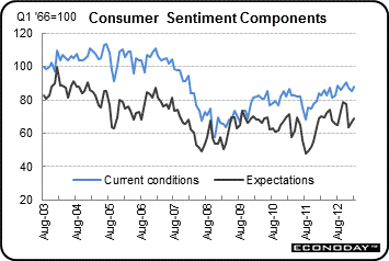 The consumer apparently is adapting to higher gasoline prices, higher payroll taxes, and slow progress on the political front related to the federal budget. But the rebound in sentiment still leaves the mood less positive than in autumn 2012.