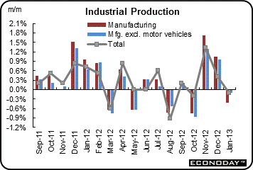 Manufacturing in January fell back but after strong gains in December and November. Industrial production in January slipped 0.1 percent, following an advance of 0.4 percent the month before (originally up 0.3 percent) and a 1.4 percent jump in November.