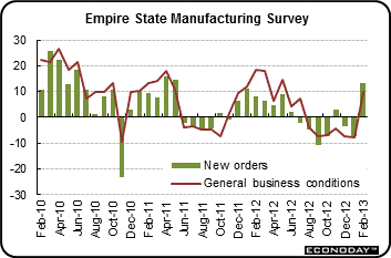The first indication on manufacturing conditions in February is resoundingly positive. The Empire State index surged 18 points to 10.04 for the first positive reading since July. A positive reading for this index indicates month-to-month growth in general business conditions. And note that a level of 10 is an especially strong rate of growth.