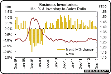 Businesses brought down their inventories relative to sales in the fourth quarter, setting up what should be a rebuilding for the first quarter and possibly second quarter of this year. Business inventories rose a modest 0.1 percent in December which made for a 1.4 percent sequential gain from the third quarter. The sequential gain for business sales was slightly higher, at 1.5 percent which brings down the stock-to-sales ratio very slightly to 1.278 versus the third quarter's 1.283.
