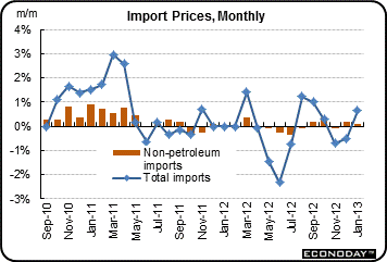 Import prices rose a sharp 0.6 percent in January, pulled higher by a 2.9 percent monthly jump in petroleum prices. This reflects the recent run up in crude oil prices. Most likely, this will translate into a bump up in the headline CPI for January (and the PPI for January), based on higher energy costs. However, import prices also suggest modest gains for goods outside of energy.