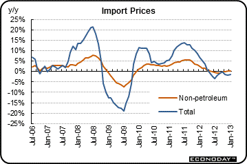Taking the longer view, the January gain in overall import prices followed declines of 0.5 percent (revised) and 0.7 percent in the two prior months and did little to raise the year-on-year rate which remained in the deflationary column at minus 1.3 percent. However, import prices are heavily based on commodities and these negative numbers will not carry over to readings on consumer prices.