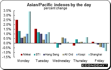 Equities were mostly up on the week with only the S&P/TSX Composite retreating. The SET gained 4.9 percent while the Shanghai Composite rallied 4.5 percent. Several indexes scored gains of over 3 percent including the Nikkei, IBEX, the Dow and Bolsa.