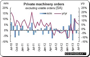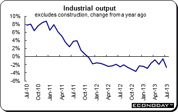 July industrial production (excluding construction) dropped 1.5 percent — the steepest decline since September 2012. Annual workday adjusted growth deteriorated from a significantly weaker revised drop of 0.4 percent at quarter-end to a decline of 2.1 percent for the worst performance since February. July's downswing was broad based with all the major sectors seeing renewed monthly declines in production. Capital goods (down 2.6 percent) recorded the most marked decline but consumer durables (down 2.2 percent) were not far behind and neither nondurable consumer goods (down 0.9 percent) nor intermediates (down 0.7 percent) performed much better. Energy also had a negative impact, falling 1.6 percent from June. Regionally the monthly headline decline was led by Germany where output slumped 2.3 percent and more than reversed June's 2.2 percent gain. France (down 0.6 percent) and Italy (down 1.1 percent) similarly struggled to leave just Spain (up 0.1 percent) among the larger member states avoiding a contraction. Elsewhere there were also fresh declines in Portugal (down 3.2 percent), Greece (down 2.8 percent) and the Netherlands (down 0.5 percent).