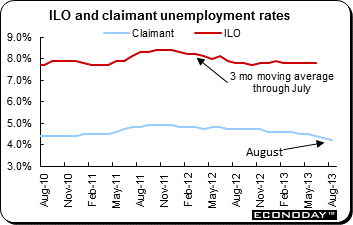August claimant count dropped 32,600 after a larger revised 36,300 slide last time. Over the last three months this measure of unemployment now shows a decline of 98,300. The jobless rate also edged a notch lower to 4.2 percent, its weakest level since February 2009. According to the labour force survey statistics that form part of the BoE's new forward guidance, unemployment in the three months to July dropped 24,000 or 1.0 percent and was 105,000 lower on the year. In turn this saw the key jobless rate dip from 7.8 percent in the February to April period to 7.7 percent. Employment in the same period increased a very healthy 80,000 on the quarter, wholly attributable to a 95,000 jump in full time jobs as part time positions fell 15,000. Wages remained very subdued. Annual headline average earnings growth in July was just 1.1 percent, down from 2.2 percent in June and slightly softer than anticipated. Single month earnings growth was only 0.6 percent while headline regular pay was up just 1.0 percent on the year, reversing a minor blip higher last time.