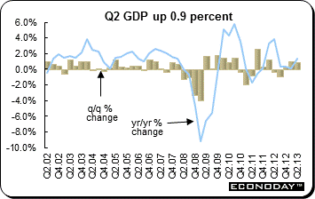 Second quarter gross domestic product was revised upward to an increase of 0.9 percent on the quarter or at an annualized rate of 3.8 percent as expected. GDP was up 1.3 percent from the same quarter a year ago. On the quarter, domestic demand was revised upward from 0.4 percent to 0.7 percent. CAPEX was revised significantly to an increase of 1.3 percent from a preliminary estimate of a decline of 0.1 percent. This was the first increase for CAPEX in six quarters. Public investment was revised upward to 3.0 percent from 1.8 percent.