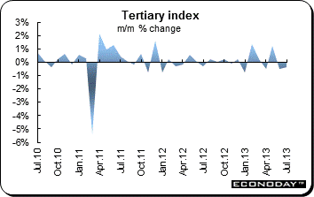 July tertiary index declined 0.4 percent on the month and was up 1.0 percent from a year ago. Industries that declined included wholesale & retail trade (down 2.3 percent), finance & insurance (down 2.1 percent), accommodations, eating & drinking services (down 1.6 percent) and miscellaneous services except government services (down 0.7 percent). Also lower on the month were medical, health care & welfare, compound services and learning support. The losses above were partially offset by gains in scientific research, professional & technical services (up 2.4 percent), information & communications (up 1.0 percent) and living related & personal services & amusement services (up 1.7 percent). Real estate & goods rental & leasing and electricity, gas, heat supply & water also advanced.