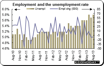 August employment surprised and declined 10,800. This was the second consecutive month that employment declined. The unemployment rate inched up 0.1 percentage point to 5.8 percent. The number of people employed decreased by 10,800 to 11,637,100 in August. The decrease in employment was due to declines in both full and part time employment. Part time employment was down 8,200 to 3,508,300 and full time employment was down 2,600 to 8,128,800. The decline in total employment was mainly driven by a decrease in male full-time employment and a decline in female part-time employment. The number of people unemployed increased by 9,400 people to 714,100. The seasonally adjusted labour force participation rate decreased 0.1 percentage point to 65.0 percent in August. The seasonally adjusted underemployment rate was 7.8 percent in August 2013. Combined with the unemployment rate of 5.8 percent, the latest seasonally adjusted estimate of total labour force under-utilization was 13.7 percent in August.