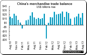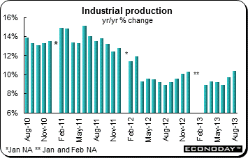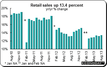 August retail sales were up 1.17 percent on the month and were up 13.4 percent on the year after rising 13.2 percent in July. This was strongest showing so far in 2013. Year to date growth was 12.8 percent, unchanged from last time. Annual sales growth accelerated modestly in both the urban (13.1 percent from 12.9 percent) and rural (15.1 percent from 15.0 percent) areas and most spending categories made fresh headway. Notable among these were home appliances (12.8 percent after 7.5 percent), cosmetics (16.2 percent after 10.1 percent) and furniture (21.3 percent after 17.6 percent). Oil and gas purchases also climbed from a 9.9 percent to a 12.7 percent rate. The main areas of weakness were gold, silver & jewelry (21.8 percent after 41.7 percent) and communications equipment (16.0 percent after 22.7 percent).