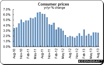 August consumer prices eased to an increase of 2.6 percent when compared with a year ago. The CPI was up 2.7 percent in July. On the month, the CPI was up 0.5 percent after edging up 0.1 percent in July. For the year to date, the index was up 2.5 percent. Urban prices were up 2.5 percent while rural prices jumped 2.9 percent. Food prices eased to an increase of 4.7 percent from 5.0 percent the month before while non-food items were up a benign 1.5 percent after 1.6 percent. Clothing prices were up 2.2 percent for a second month. Transportation & communication prices were unchanged on the month.