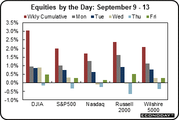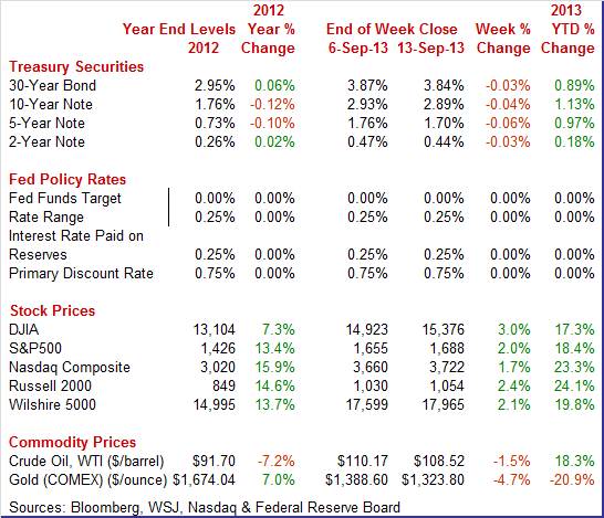 Equities advanced significantly this past week despite tepid economic news on the consumer sector. The strongest gains of the week posted Monday with most key indexes rising more than 1 percent. Stocks got an early boost after China reported a pickup in exports in August, and news on Syria—that a diplomatic solution might be reached regarding chemical weapons instead of military strikes—helped calm investor jitters about the region. The Dow climbed over the 15,000 benchmark again.