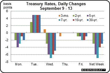 Treasury rates declined moderately for the week. Throughout, an undercurrent was growing belief that the September 18 FOMC statement would at most announce a small amount of tapering initially. This started Monday with a small decline in yields. However, yields increased Tuesday on reversal of flight to safety as tensions over Syria eased.