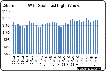 The spot price of West Texas Intermediate fell moderately this past week. After hitting a two-year high the prior Friday, crude fell Monday and Tuesday on an easing of worries that the U.S. would lead a military strike against Syria with daily decreases of a little more than a dollar a barrel and about a buck and half, respectively. The concern is that military conflict could spread and interrupt supply flows—notably through the Suez Canal.