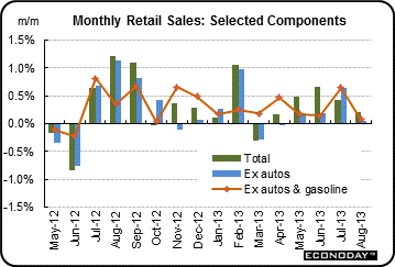 For August, sales strength clearly was in motor vehicle sales. Outside of autos, components were mixed but net flat. However, August followed a robust July and some deceleration probably should be expected. But also, slippage in consumer confidence may be holding back spending.