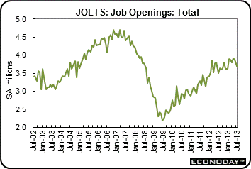 Jobs were harder to find in July. There were 3.689 million job openings on the last business day of July, down marginally from June at a revised 3.869 million. The job openings rates slipped to 2.6 percent from 2.8 percent in June.