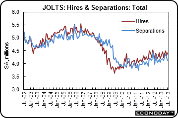 The hires rate, 3.2 percent, and separations rate, 3.0 percent, were little changed in July. But looking at levels, there was modest improvement. Hires edged up to 4.419 million from 4.318 million in June while separations eased slightly to 4.109 million in July from 4.228 million the month before.