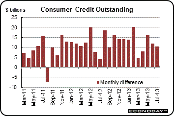 Consumer credit grew at a slightly slower pace in July, up $10.4 billion versus a revised $11.9 billion in June. Revolving credit shows weakness for a second month, down $1.8 billion versus June's dip of $3.7 billion in declines that suggest credit-card use is down.