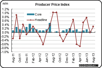 Producer prices accelerated in August on food and energy. The August producer price index rose 0.3 percent after no change in July. The core rate, which excludes both food and energy, was flat after a 0.1 percent rise in July. Expectations were for a 0.1 percent increase.