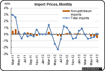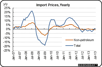 Currently, inflation is not being imported to the U.S. Instead, there continues to be more downward price pressure than upward pressure in import and export price data. Import prices were unchanged in the August report following a slight 0.1 percent revised uptick in July that follows 4 prior months of declines. Year-on-year, import prices were down 0.4 percent.
