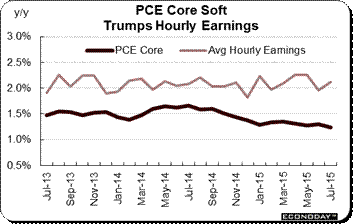 There's no hurry for a rate hike based on the July personal income and outlays report where inflation readings were very quiet. Core PCE prices, the most closely watched inflation indicator of all, rose only 0.1 percent in the month with the year-on-year rate moving downwards, not upwards, to a very quiet plus 1.2 percent. Total prices are also quiet, also at plus 0.1 percent for the monthly rate and at only plus 0.3 percent for the yearly rate. The accompanying graph compares the year-on-year rates of the PCE core, the dark line, with the light line of average hourly earnings. The PCE core has definitely been sagging and is not pointing to any obvious risk of acceleration, especially given the steep declines that have hit commodity prices. In contrast, average hourly earnings have been trending slightly above the 2 percent line but would have to burst substantially higher in Friday's employment report to become a major issue at the September FOMC.