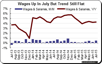 The personal income and outlays report for July was solid throughout with outlays, boosted by vehicle sales, up a respectable 0.3 percent and income, boosted by wages & salaries, up 0.4 percent. Wages & salaries jumped 0.5 percent for the largest gain since November. The gain is welcome and, as seen in the blue columns in the lower right of the graph, ends a long flat spell. But the gain isn't enough to reverse the trend which, seen in the year-on-year rate of the brown line, has been flat so far this year, at 4.2 percent in the three of the last four months and well down from nearly a 6 percent trend late last year.