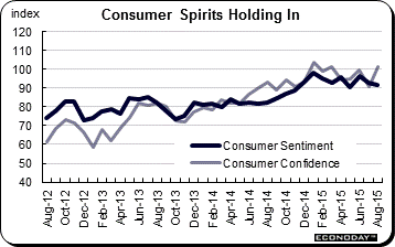 Fed policy makers are spending a lot of time talking about the importance of consumer confidence measures where general strength has been pointing to continued gains for household spending. The consumer sentiment index, the dark line in the graph, points to no more than a moderate effect from China's gyrations. The index, which comes out twice a month, came in below expectations, at 91.9 for the final August reading which roughly implies a 91.0 pace over the last two weeks. This is the softest pace since May and the doves can argue that market events in China are hurting consumer confidence. But the hawks can argue that the effect isn't that great. The consumer confidence report, which comes out only once a month and is the light line in the graph, shot higher in August but the cut-off date for the sample was at mid-month which was before the worst of the Chinese mess. Still, there was one very unusual reading in the consumer confidence report and that was a rare 6.5 percentage point drop to 21.9 percent in those describing jobs as currently hard to get. This is an unusually strong signal that points to outsized gains for the August employment report, just what would be needed to revive talk of a September rate hike.