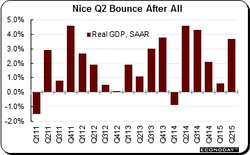 The big economic news of the week came with the strong upward revision to second-quarter GDP, to annualized 3.7 percent vs 2.3 percent for the initial estimate and compared with the weather-depressed 0.6 percent gain of the first quarter. It's that big swing from the first quarter that had been expected all along, mirroring similar first-quarter to second-quarter swings in 2011 and 2014. Residential investment was very strong, at plus 7.8 percent in the quarter, with improvement in net exports and a build in inventories also helping the revision. Final demand proved very solid, at plus 3.5 percent. GDP points to better-than-expected momentum going into the current quarter where early forecasts are still modest, in the 2-1/2 percent range.
