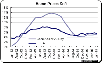 Interesting data, almost conflicting data, came out of the housing sector during the week. New home sales rose solidly in July, up 5.4 percent to a 507,000 annual pace. Year-on-year, sales were up 26 percent in the month. Sales are hot and available homes for sale are scarce which will continue to make building permits one of the economy's bright spots. But, in a reminder that inflation is hard to find, the appreciation in home prices has been very soft, this despite solid sales and low inventories. The year-on-year price of a new home in July did rise to a median $285,900 but the year-on-year rate was only plus 2.0 percent which is a tiny fraction of the gain in sales. Two separate reports during the week on prices of existing home sales also showed weakness. The FHFA house price index came in flat at a year-on-year 5.6 percent with Case-Shiller's 20-city index even more flat, at 5.0 percent. The current lack of house price inflation may not be a central topic at the FOMC but it is consistent with soft pricing in the economy. It's also a reminder that readings on inflation expectations in both the consumer confidence and consumer sentiment reports have been moving lower.