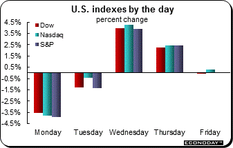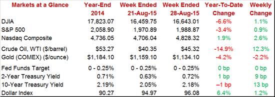 Stocks broke down on Monday but recovered through the week with the Dow up 1.1 percent at 16,643. Money backed out Treasuries where yields rose, including a 9 basis point hike in the 2-year to 0.72 percent. This is a big move for the 2-year which may see more volatility this week tied, not only to China, but also to expectations for the September FOMC. Oil was the week's big gainer, moving from under $40 at mid-week to end near $45.50. The gain is welcome but won't boost August inflation data.