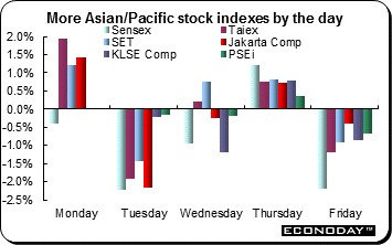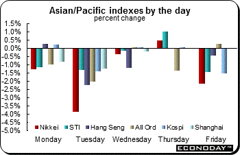Meanwhile on the week, equities plunged. The sole index that advanced was the SET. Losses ranged from 0.2 percent (Taiex) to 7.0 percent (Nikkei). Only the Nikkei, CAC, DAX and MIB are still positive so far in 2015.