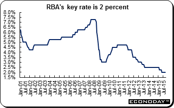 Second quarter GDP increased a less than expected 0.2 percent on the quarter – analysts expected an increase of 0.4 percent. From a year ago, GDP was up 2.0 percent, also below expectations. Reduced mining and construction activity, coupled with a decline in exports, were the main factors in the slowdown in economic growth. Australia has not experienced a recession since 1991. Positive contributions to GDP growth came from the domestic final demand components of household and government consumption. The financial, transport and health industries each contributed 0.1 percentage point to GDP growth. Gross fixed capital formation was up 0.4 percent on the quarter but sank 3.3 percent from a year ago. Final consumption expenditures were up 0.9 percent and 2.9 percent from a year ago.