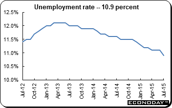The number of people out of work dropped 213,000 in July to reduce the unemployment rate by 0.2 percentage points to 10.9 percent, its lowest reading since February 2012. For once, the headline drop was not largely attributable to the strength of the German labour market as the unemployment rate there held steady at 4.7 percent (albeit still the lowest in the region). Rather, in addition to a suspiciously steep 0.5 percentage point drop to 12.0 percent in Italy, there were significant declines among a number of the smaller member states: Croatia (15.1 percent after 15.4 percent), Malta (5.1 percent after 5.3 percent) and Portugal (12.1 percent after 12.3 percent). Elsewhere among the larger economies performances were mixed with a 0.2 percentage point decline in Spain (to 22.2 percent) contrasting with a 0.1 percentage point increase in France (to 10.4 percent). The unemployment rates are calculated using Eurostat's definition of unemployment.