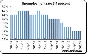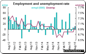 August employment was up 12,000 for the best performance in three months but with the participation rate up a tick at 64.0 percent, the jobless rate was up 0.2 percentage points to 7.0 percent. This was its first increase since February and its highest level since last August. Last month's increase in employment was largely due to a 54,400 jump in full-time jobs while part-time positions dropped 42,400. Private sector payrolls expanded a modest 6,300 and government added 27,200 but the number of self-employed was down 21,600. Goods producing industries dropped 5,200 — manufacturing posted a 3,200 decline and construction a 3,600 decrease. Other changes were only minor although natural resources advanced 2,300. Consequently, it was a 17,200 spurt in services that was responsible for the headline increase in employment. Here, much of the work was done by education (11,100), and public administration (14,000). Health care and social assistance (8,000) also climbed significantly but trade (1,300) was little changed and transportation & warehousing (down 5,500) struggled. Professional, scientific & technical services (down 9,600) similarly had a poor month as did information, culture & recreation (down 8,600).