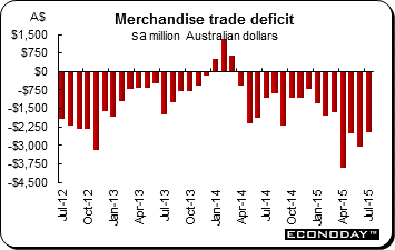July's merchandise trade deficit narrowed to A$2.48 billion from a deficit of A$3.05 billion in June. Exports were up 2.3 percent and 0.3 percent on the year while imports inched up 0.1 percent and 5.3 percent from a year ago. The value of iron ore, the country's top export, was A$4.097 billion in July, down from A$4.542 billion in June, but revenue from gold, natural gas, wheat, copper, nickel, lead and silver saw increases. Net exports under merchanting were up A$2 million. Rural goods exports dropped A$76 million while nonrural goods exports were down A$9 million. An increase in capital-goods imports was offset by a decline in intermediate goods. Capital-goods exports rose as a result of exports of civil aircraft and confidentialized items. Intermediate goods imports fell owing to fuels and lubricants.
