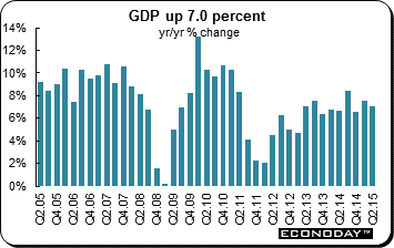 Second quarter gross domestic product expanded 7.0 percent from a year ago, down from 7.5 percent in the January to March period and well short of expectations. (Note that doubts about the accuracy of the GDP data persist in the wake of substantial methodological changes introduced earlier this year.) Growth came mainly from the trade, hotel, transport & communications subsector where activity was up 10.3 percent on the year. Manufacturing and agriculture both achieved a 6.5 percent rate and government expanded 8.9 percent. However, expansion rates elsewhere were relatively sluggish including utilities at 5.0 percent; financial, insurance, real estate & professional services at 6.3 percent; and construction at just 4.4 percent. Mining & quarrying grew only 1.0 percent.