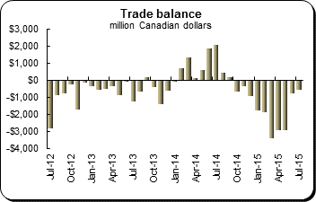 July merchandise trade deficit was C$0.59 billion after a larger revised C$0.82 billion shortfall in June. The improvement was due to a 2.3 percent monthly bounce in exports that more than offset a 1.7 percent increase in imports. The real trade balance also strengthened as export volumes climbed 1.0 percent and imports rose 0.5 percent. However, the surplus on trade with the U.S. shrank from C$4.36 billion to C$3.59 billion as sales across the border advanced 2.1 percent and purchases climbed 4.3 percent. Within the overall monthly gain in exports, there were sizeable increases in aircraft & other transportation equipment & parts (19.2 percent), motor vehicles & parts (9.9 percent) and industrial machinery, equipment & parts (5.5 percent). However metal ores & non-metallic minerals (down 11.6 percent) and energy (down 5.7 percent) declined. Imports were boosted by solid increases in aircraft & other transportation equipment & parts (22.9 percent), energy (12.8 percent) and metal ores & non-metallic minerals (10.9 percent). Metal & non-metallic mineral products (down 9.6 percent) were the only decline.