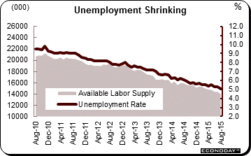 There are plenty of weak details in the August employment report but the hawks at the FOMC have a major policy point — that the unemployment side of the labor market is getting thinner and thinner. The unemployment rate is down 2 tenths to a recovery low of 5.1 percent and is suddenly right at the 5.0 percent threshold ahead of schedule. Available labor supply, at just under 14 million, fell 440,000 for the steepest monthly decline since December. But judging by the last cycle, there still may be some slack left in the labor market. The unemployment rate held below 5 percent from 2005 to 2007 while labor supply held below 13 million through 2005 and 2006 and moved under 12 million in 2007. Still, full employment, if not already here, is around the corner at the same time that monetary policy remains decidedly stimulative.