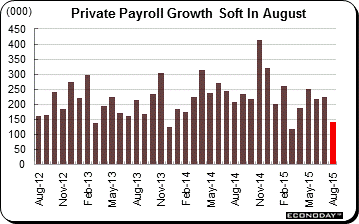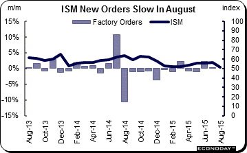 With August employment mixed, China looks to be the deciding factor at the FOMC. China's effect on the domestic economy is likely to unfold slowly compared to the effect on the nation's exports. With China's devaluation hitting at mid-month August, attention has been focused on early anecdotal reports out of the factory sector and whether China is having any immediate impact. The ISM new orders index, which incidentally is one of 10 components of the index of leading economic indicators, slowed noticeably in August, down nearly 5 points to 51.7 to indicate the slowest rate of monthly growth since April 2013. This is an attention grabber for the doves though, as the graph indicates, the ISM's index does not always move in line with actual government data. The ISM index, the dark line, has consistently come in over the breakeven 50 line to indicate month-to-month growth, though factory orders themselves, the columns in the graph, show monthly contraction more times than not. The relationship is far from airtight.