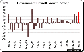Government payrolls rose a very strong 33,000 in August for a fourth straight gain. But how long will this extend? Growth in this component is typically spotty as seen in the accompanying graph. Still, government jobs are domestic jobs and have a degree of insulation from global slowing. Other domestic industries continue to add jobs including retail, business & professional services, and financial activities. Excluding government, services altogether rose a solid 164,000 which is important to note given the risk, which is certain to be cited by the hawks, of an upward revision to August which is common given adjustment difficulties surrounding the timing of the school year.