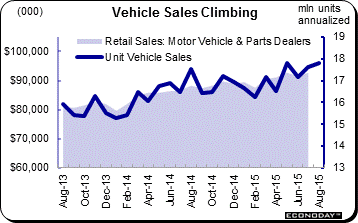 China doesn't appear to have had any immediate effect on consumer buying. Sales of motor vehicles are one of the week's highlights offering the first hard data on the consumer during August. And the news is very good with sales up a surprising 1.5 percent to a 17.8 million annual rate. The gain points to another strong month for retail sales in what would underscore the insulated strength of the domestic economy. Remember it was outsized strength in the auto sector that supported the factory sector in June and July, though August's sales gain was centered in foreign-made vehicles. Still, sales of domestic-made cars and light trucks, which make up 80 percent of all sales, are at very strong levels.