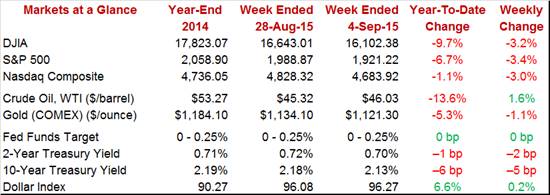 Though everyone's talking about the 17th, this month's FOMC, like all their scheduled meetings since 2013, is actually a two-day affair, both the 16th and 17th which should give policy makers plenty of time to go through the data and, hopefully, clarify their decision for the rest of us. It was another brutal week in a reminder that it will be the state of the markets going into the FOMC that will likely determine the outcome of the FOMC. Major indexes were down 3 percent in the week with the Dow losing 3.2 percent for a year-to-date loss of 9.7 percent. Oil rallied through much of the week to end with a 1.6 percent gain for WTI at $46.03. And, in a signal of sorts that the Fed is not expected to announce liftoff, rates fell back in the week with the 2-year Treasury down 2 basis points to 0.70 percent and the 10-year down 5 to 2.13 percent.