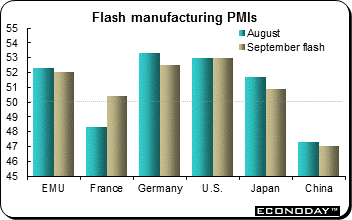 Although it was too late to salvage most equity indexes, Fed Chair Janet Yellen's Thursday night remarks sent equities higher on Friday. Germany's Ifo survey inched up in September while a spate of flash manufacturing PMIs disappointed. China's PMI reading shocked when it skidded to a six and a half year low.